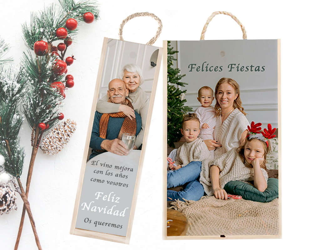 Crea tu propia caja de madera para vino con fotos y textos, es un regalo original y único para todo tipo de eventos: cumpleaños, aniversarios, Navidad, boda, San Valentín, día de la Madre o del Padre.